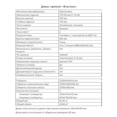 Габариты (ШхГхВ): 2330х950х910 мм